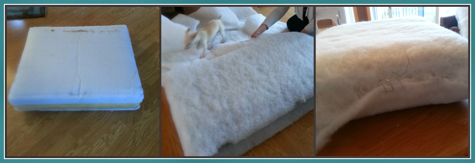 - There is usually no need to remove the existing fabric on the cushions, but because these had welting, we thought it would be better. We added some quilt batting to soften the edges. Slip stitching the batting makes the cushion more stable. (We had lots of help in this process from “Biggie Smalls”!)