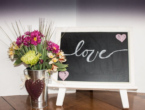 The sunny exposure in the living room is perfect for coaxing these orchids back to blooming. The silver tray protects the wooden desktop and the little silver containers bring the look together. I found these little red heart ornaments at IKEA years ago. The bring just the nicest small nod to the holiday.