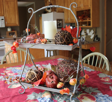 I found this great two tiered stand at a consignment shop a few years ago. It is a great way to display a vignette with a few dried pomegranates some grapevine orbs, sprigs of Chinese Lantern and preserved leaves.