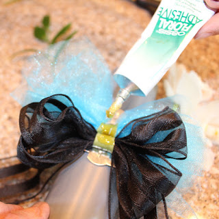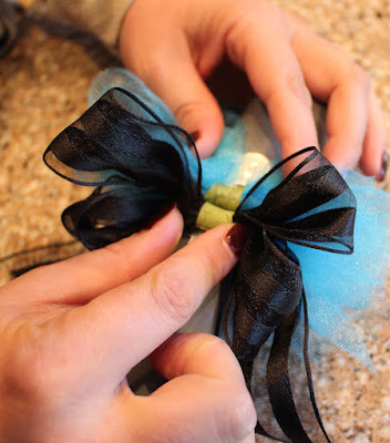 The tulle and ribbon are hot glued onto the metal base of the wristlet.