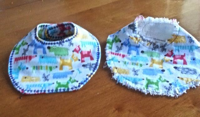 The one on the left is done with a frayed edge….but be sure to launder the bib before you let the baby wear it or you will have lint mixed with drool everywhere!