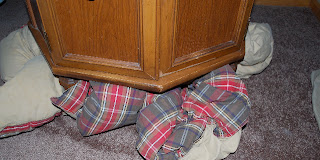 Just stuff an old comforter underneath and pull it around until you like the way the bottom looks. If your cloth is long enough, you can even tuck it around some old books to keep it in place.