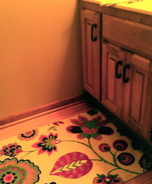 I was “just sittin'” in my newly “summerized” powder room…..admiring the new rug I found that just perfectly matches the little paisley towel…..SEEE?