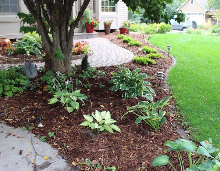 The placement of mulch throughout this area is a nice clean look for all the Hosta we have waiting to replant.