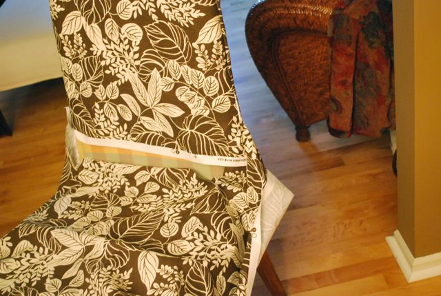 Step 7: Use a ruler to measure and pin the hem. When you sew the pieces together…the bottom often shifts so this is critical for an even hem on each chair. I was awfully glad this pattern was so forgiving.