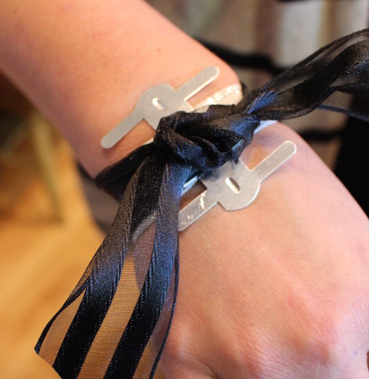 The tulle and ribbon are hot glued onto the metal base of the wristlet.