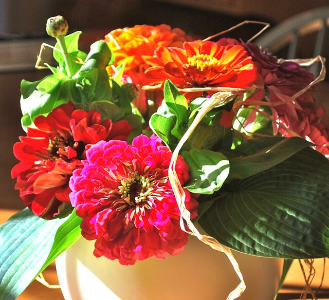 Anyway…..here are the two arrangements that I did using my $7 bunch of Zinnias…..It is Saturday and they still look almost fresh from the garden!