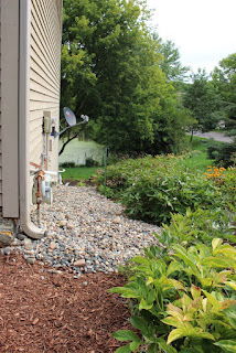This was a suggestion from Tim the Landscaper. If we had used mulch here, it would have washed down the slope. The bigger rock was just dumped over the old stuff which also saved money.