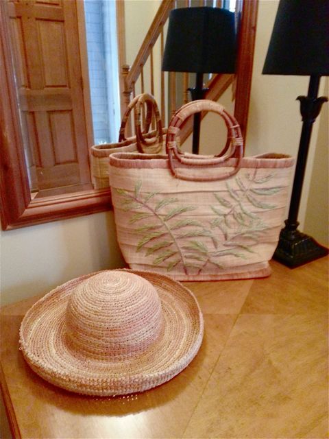 A summer hat tossed on the entryway table along with a straw beach bag look like I am ready to head to the beach at any moment!