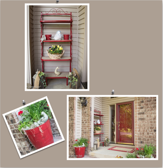 It moved outside a couple of years ago and the original white surface was painted hammered bronze. This year…..what I was “thinking” was RED! And now it is red. Those red pots on the steps started as bargain plastic green….then they were blue and now they are red!