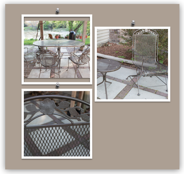 The metal patio set that sits under the deck. I end up doing a cover coat every year. The set started out white, then it was black, then green and now it is hammered bronze. I suppose you could argue that we have had 4 sets of furniture.