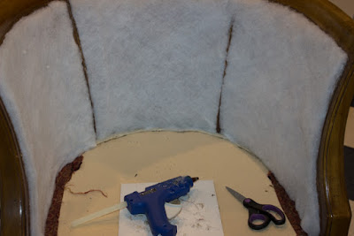 I cut a piece of fabric for the bottom of the seat. The front edge was stapled and folded in. Then used staples all around the back.
