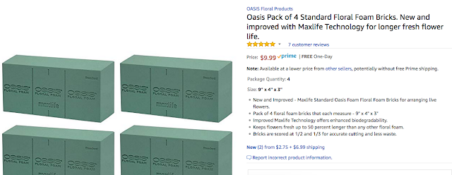 This is by far the easiest way to create a formal arrangement. Floral foam lets you have the stems come out at angles. Your ability to control the arrangement is limited only by your artistic eye. Once you create the arrangement, keep the foam hydrated and it will last a pretty long time. Floral foam CAN NOT be reused successfully. This makes it sort of an expensive option. Amazon has the foam for a couple dollars a block. But the more you buy the cheaper it is….I just ordered 36 blocks for 20 bucks…but then….I do a lot of flower arranging!!!