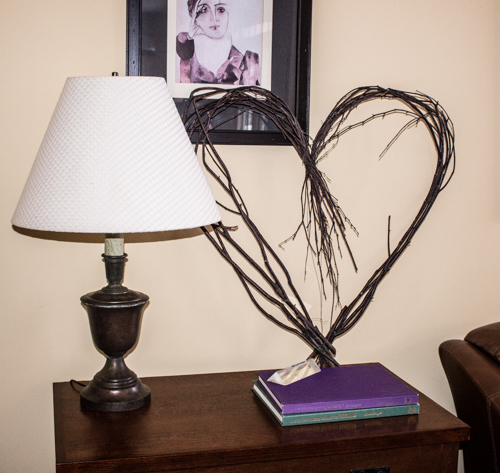 If one propped up willow wreath is good….two must be better. I will probably move this outside, but for now this works.
