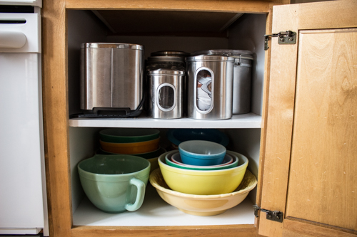 Before all of my vintage pyrex bowls were stacked in the cabinet in the lower photo. This meant that when I wanted to use them….I had to do some major lifting to get the one I wanted. I moved the bowls to the lower shelf on the smaller cabinet. Then all of the pyrex bakeware went to the wider cabinet. This is much more efficient and looks nicer too!