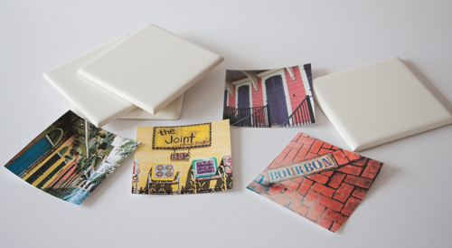 Use Mod Podge to adhere the images to plain white ceramic tiles.