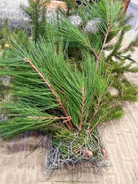 I cut a piece of chicken wire about 18 inches wide and bent the edges on each side in.  Then I rolled it into a column….this gave lots of places to tuck in the greenery!