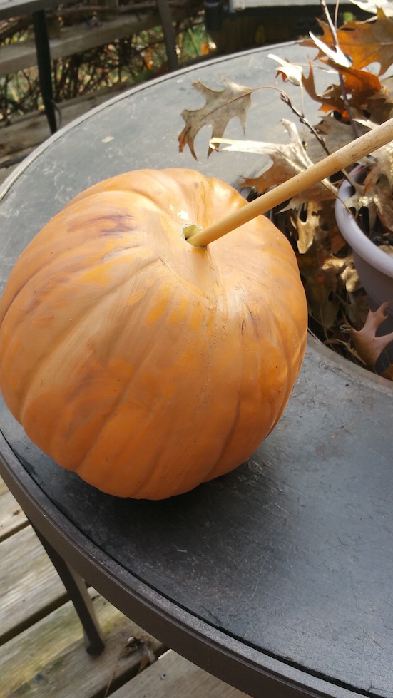 Then insert a dowel (or any stick) that is long enough to go all the way inside and still stick out the bottom of the pumpkin. It is sort of like a giant floral pick!