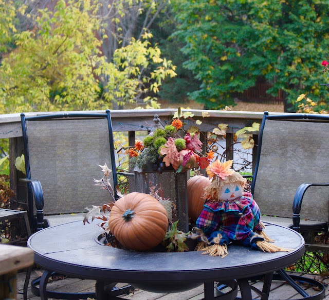 This arrangement on the deck uses artificial pumpkins that have been lightly brushed with some brown paint that was rubbed off. That took the orange down to a more natural color.