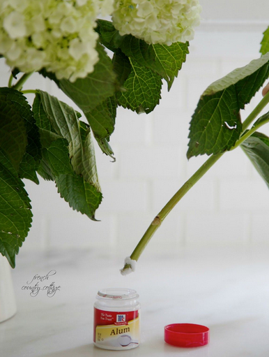 When you cut hydrangeas they can form a sticky substance over the cut that prevents the flower from sucking water up through the stem.  There are a couple of ways to prevent that “sticky stuff” from forming: dipping the stem in boiling water….putting the end of the stem in an open flame….OR this! Dip the freshly cut stem in ALUM(A common ingredient used for pickling, find it in the spice aisle.)