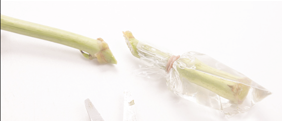 If your flowers don’t have this, you can concoct one with by bunching the stems and wrapping a water filled baggie around them with a rubber band.