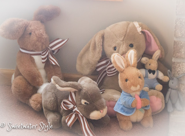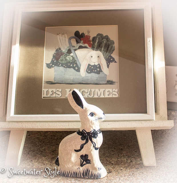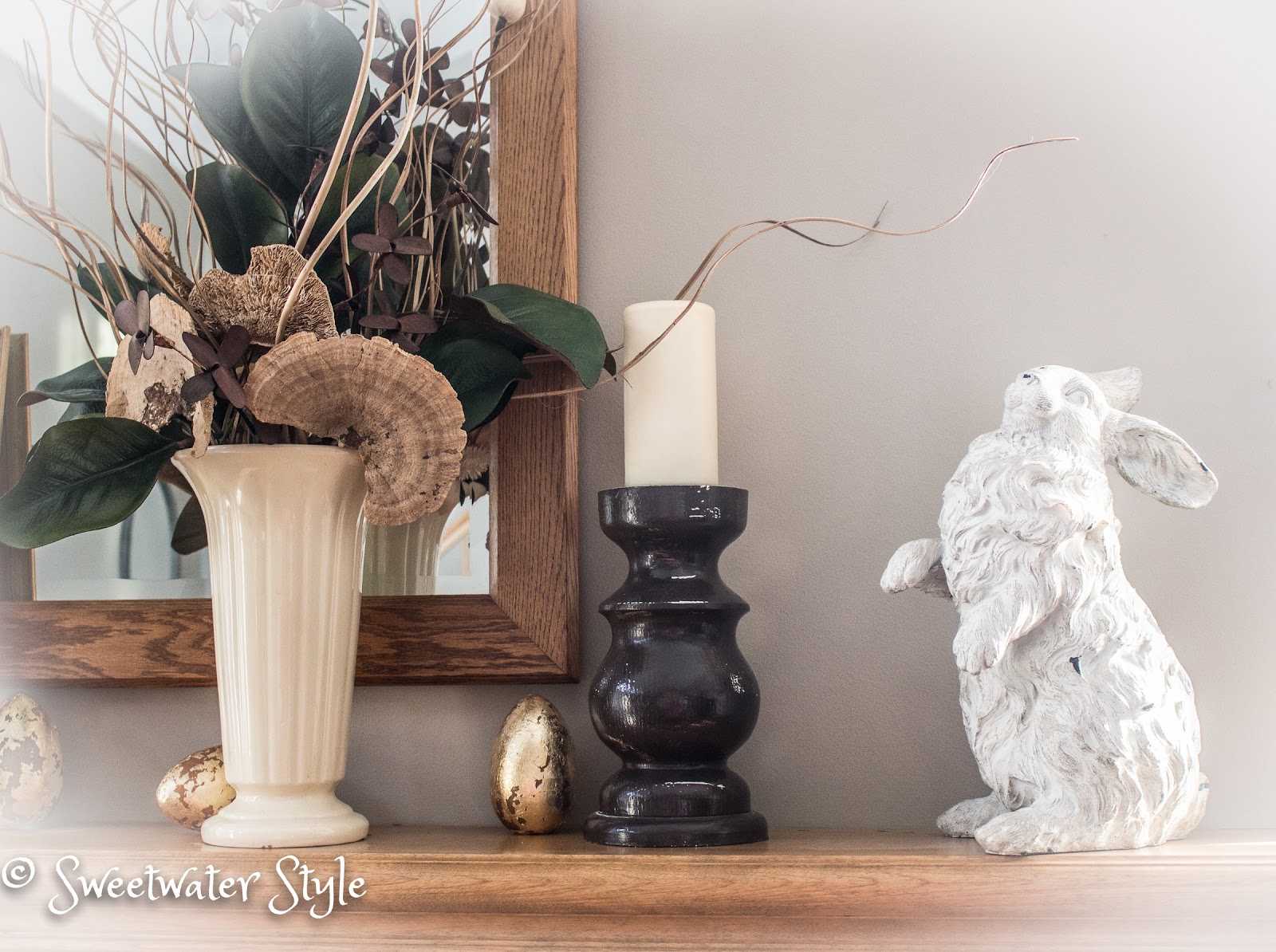 On the mantel, there is another framed bunny along with the garden sculptures and some golden eggs for fun.  The vase and candle stick components will stay after the bunnies go back into storage.