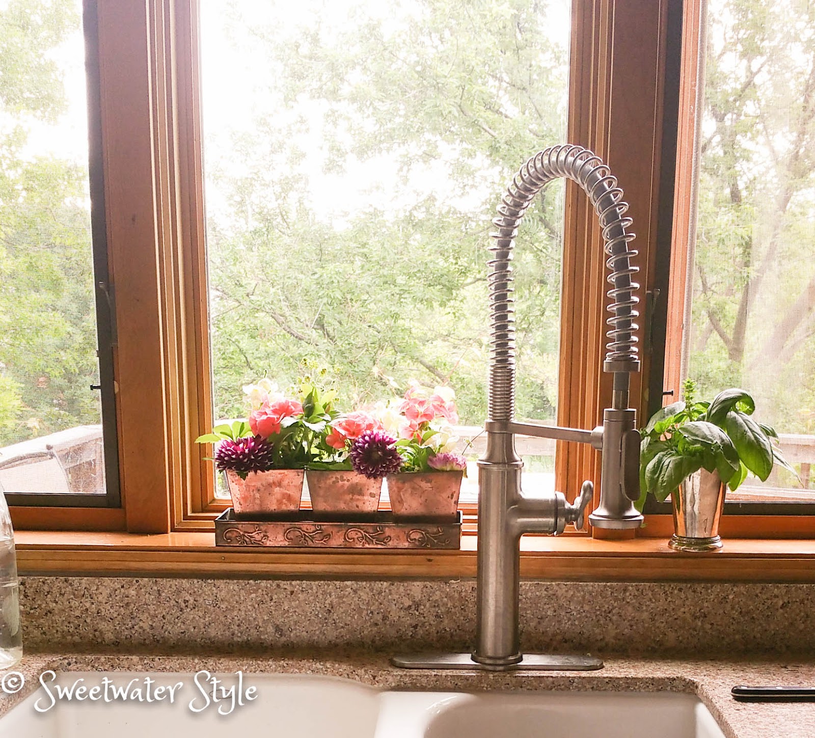 These three copper planters on a tray are a long ago thrift store find. I love how it fits perfectly on the window sill.