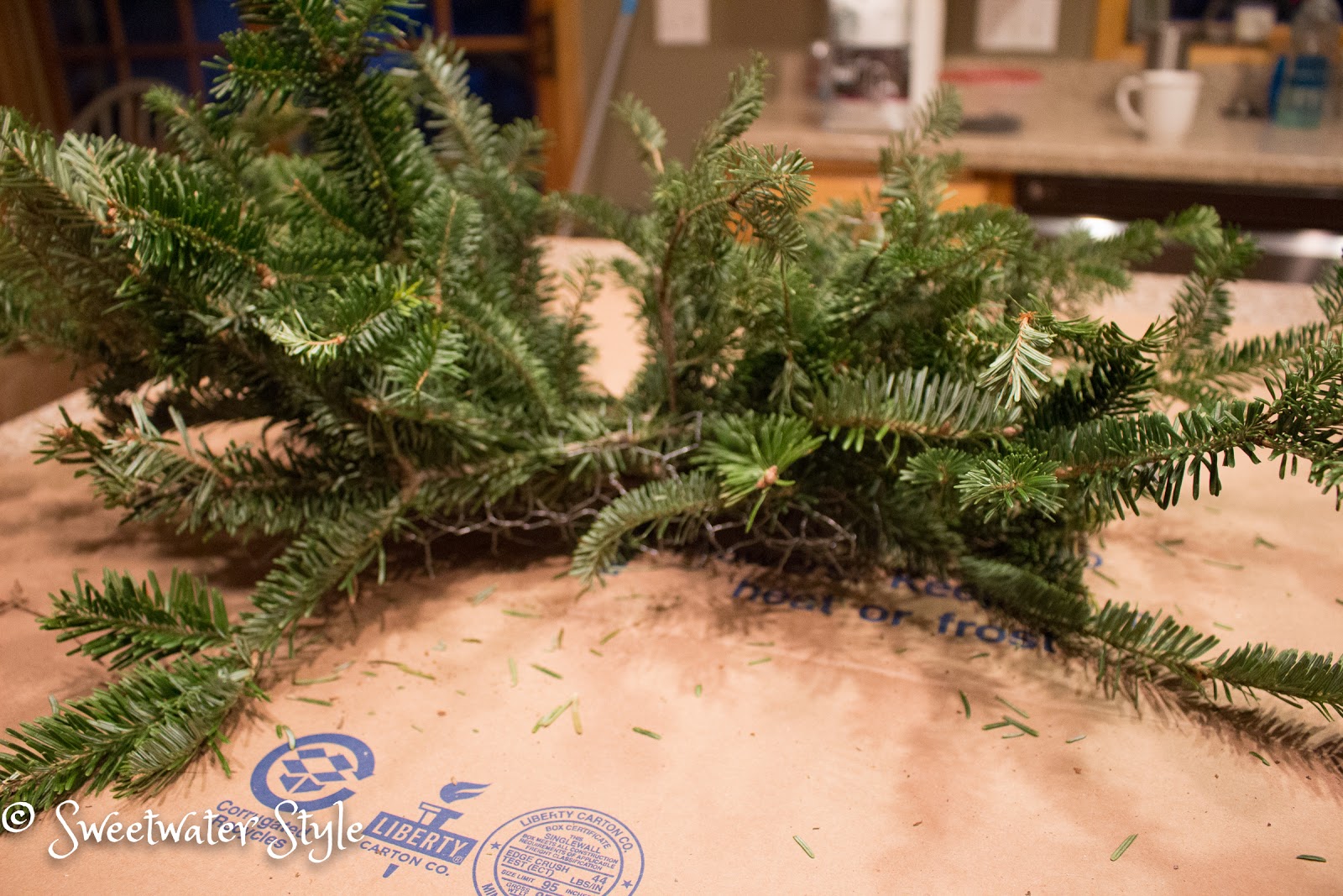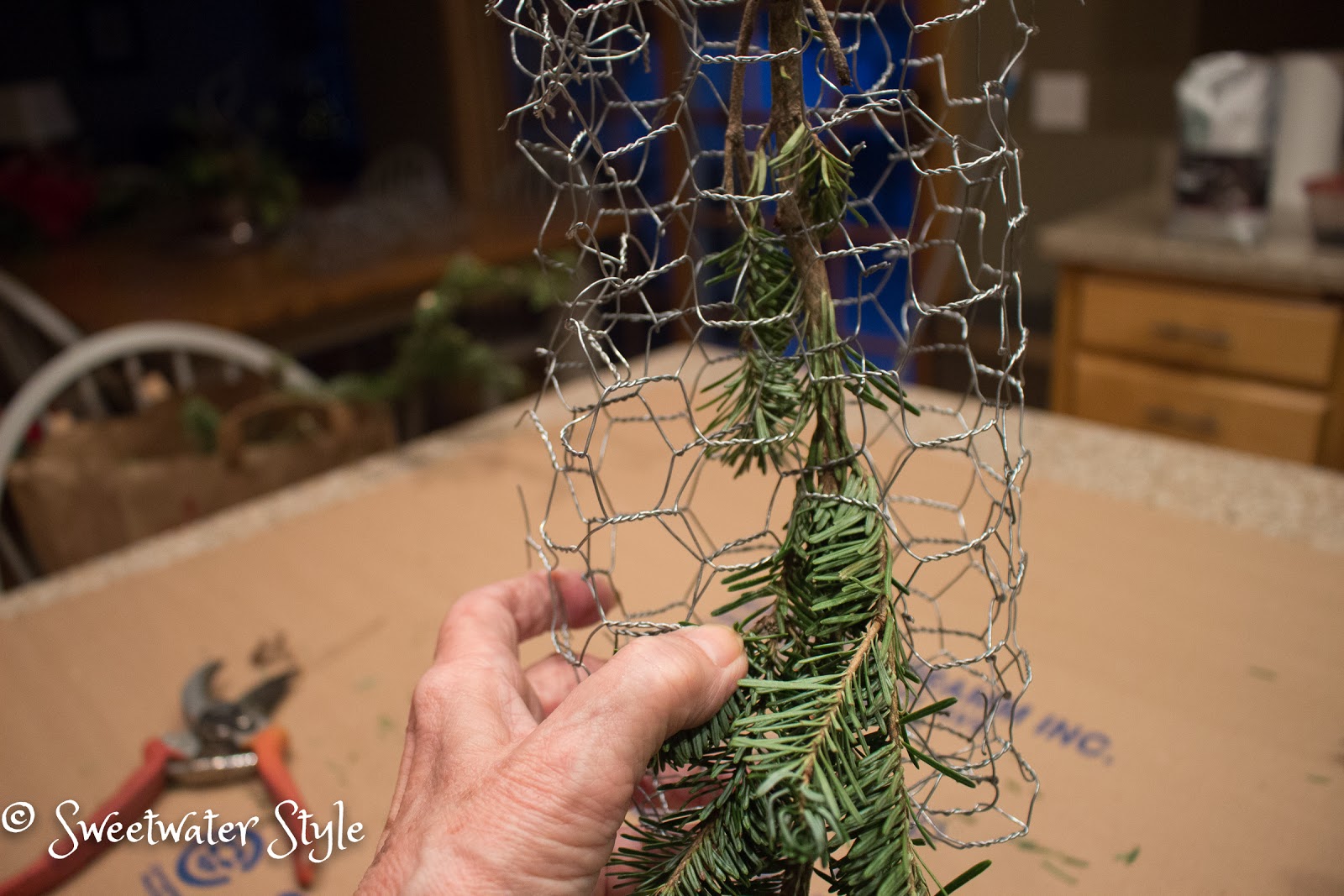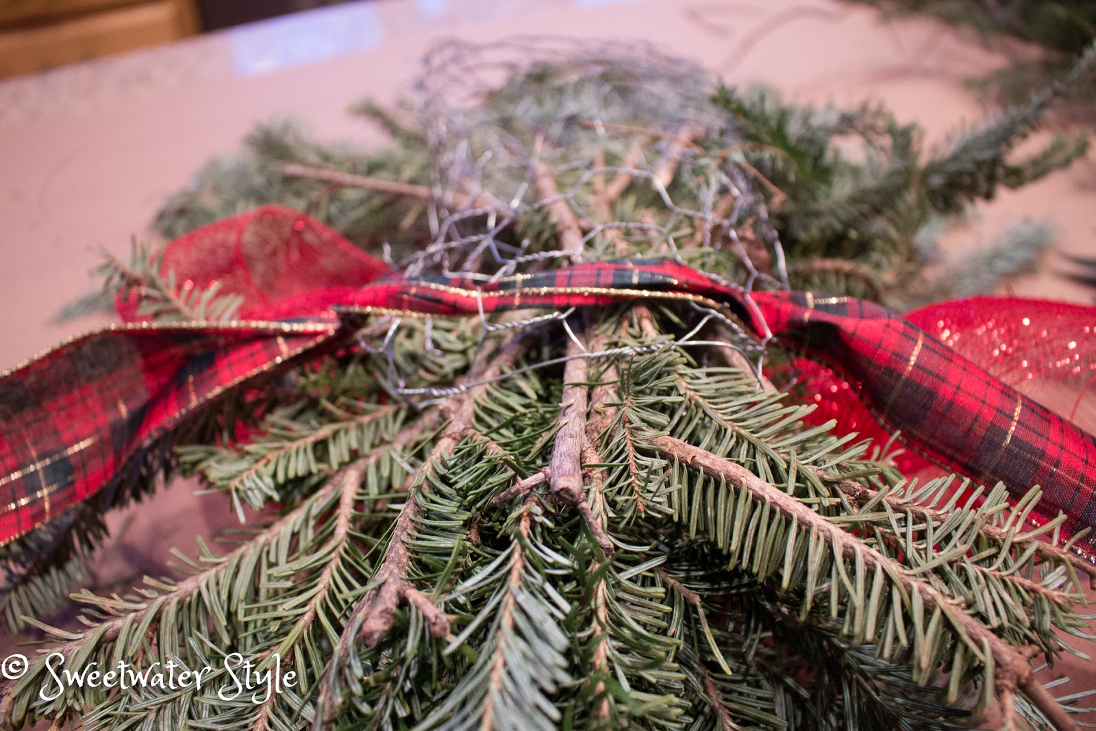 Now you have a form/base for your scraps of greenery.  I love the fact that you can use some pretty shabby greens in the back of your swag.   Just keep snipping greens and pushing them into the wire.  After you have the top and bottom of the swag the shape you like, start adding greens that stick out and make the swag look full from the front to the back.  You don’t need to put a lot of greens in the center because your bow will go there.