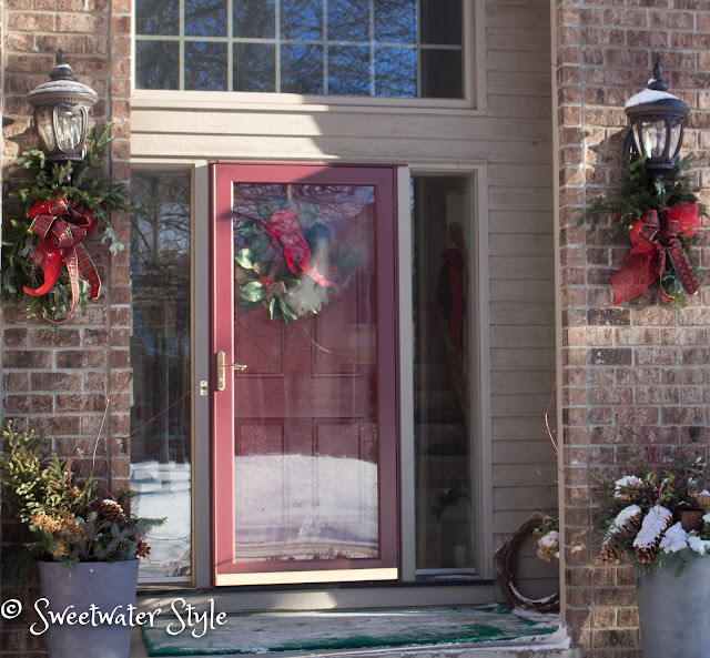 I used some of that fun netting as the background for the bow on these swags.  That stuff is easy to find…I have seen it at the dollar store, Lowes and Micheals.  I like how it makes the plaid ribbon stand out.