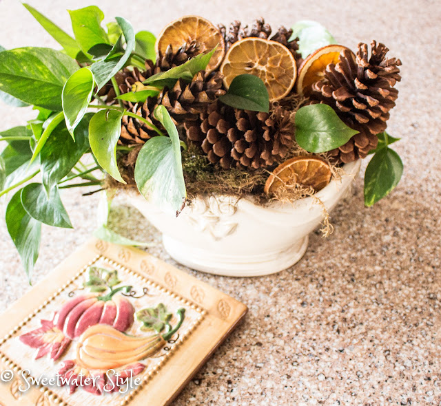 I added some pine cones and orange slices to a small potted plant. It is a nice transitional Thanksgiving vibe.