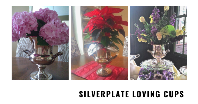 My all time favorite containers are these silverplate loving cups. The urn shape makes them easy to use to arrange flowers. They are also the perfect size for a 6 inch flowering plant. There is something so elegant about the shape…and who doesn’t love silver? I found all THREE of my silver urns at the thrift shop.