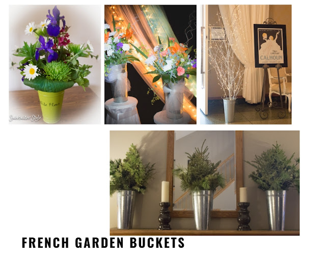 French garden buckets are another iconic shape. Big or small ones make perfect containers for a hand tied bouquet or more elaborate statement arrangements. I love the plain galvanized metal, but I often see them at the thrift store in really fun colors or with rustic stencils.