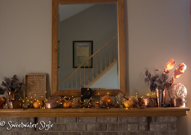 - The mantel got the “pumpkin” treatment complete with mood lighting! I used my copper collection and a great pumpkin swag that has been around forever.