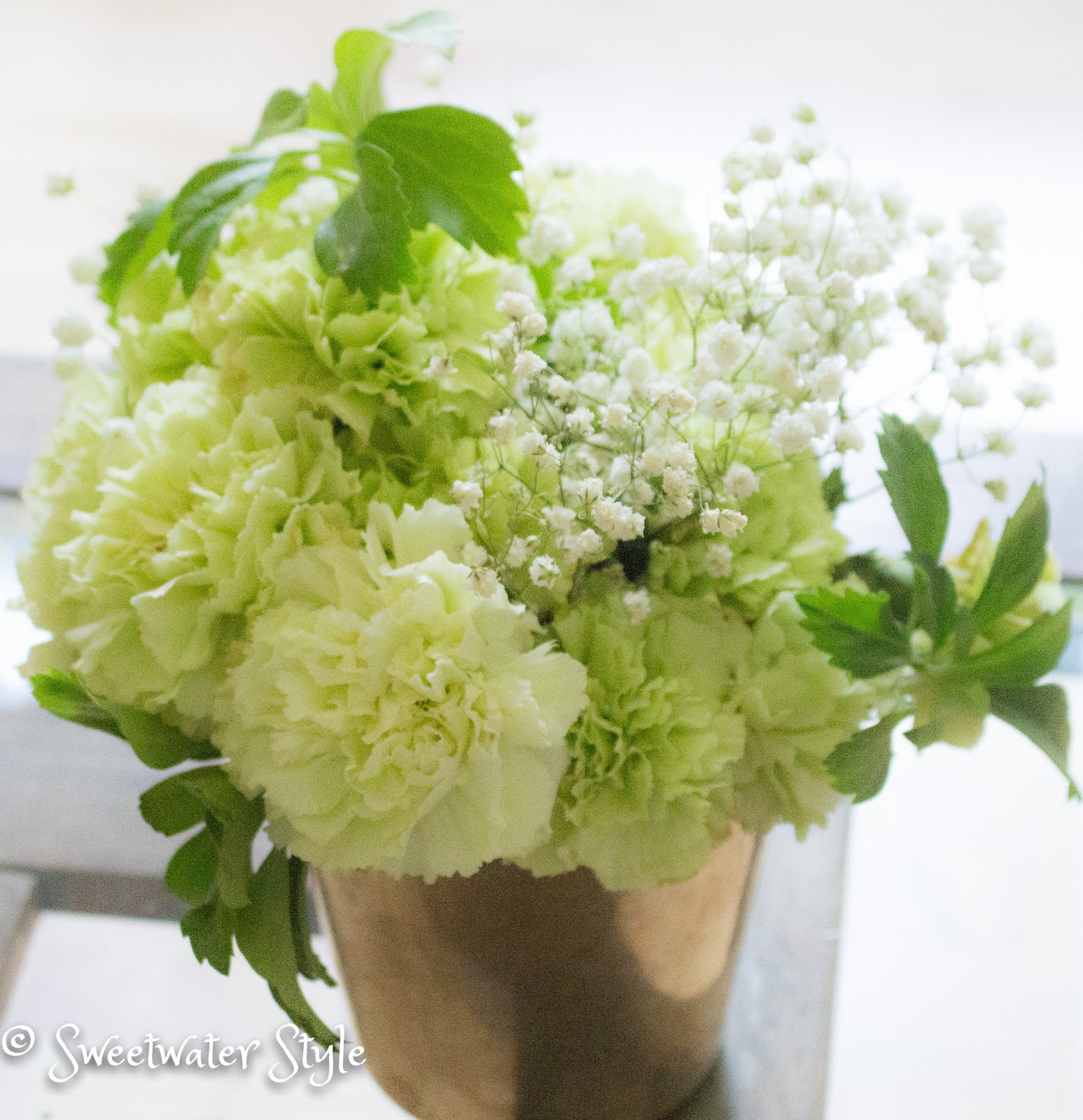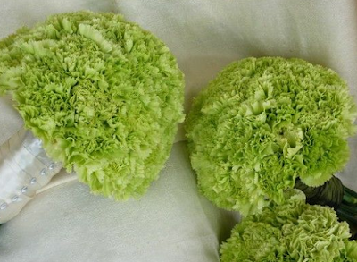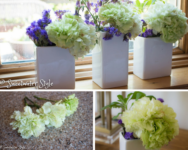These green carnations are two weeks old. They are left from an event we decorated for on June 17. While I made small arrangements from the old ones…..Mr. S asked me where the hydrangeas came from! Granted….he was across the room…..but still! So I wondered if I could make these look even more like Hydrangea!
