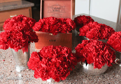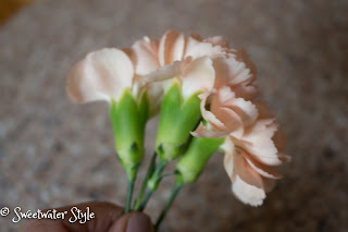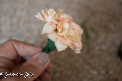 Hydrangeas are big and fluffy…..so I used 3 carnations. It was just a matter of using floral tape to hold them together. Not bad for 2 week old flowers. HMMMM…..what do you think Hydrangeas would look like after 2 weeks?