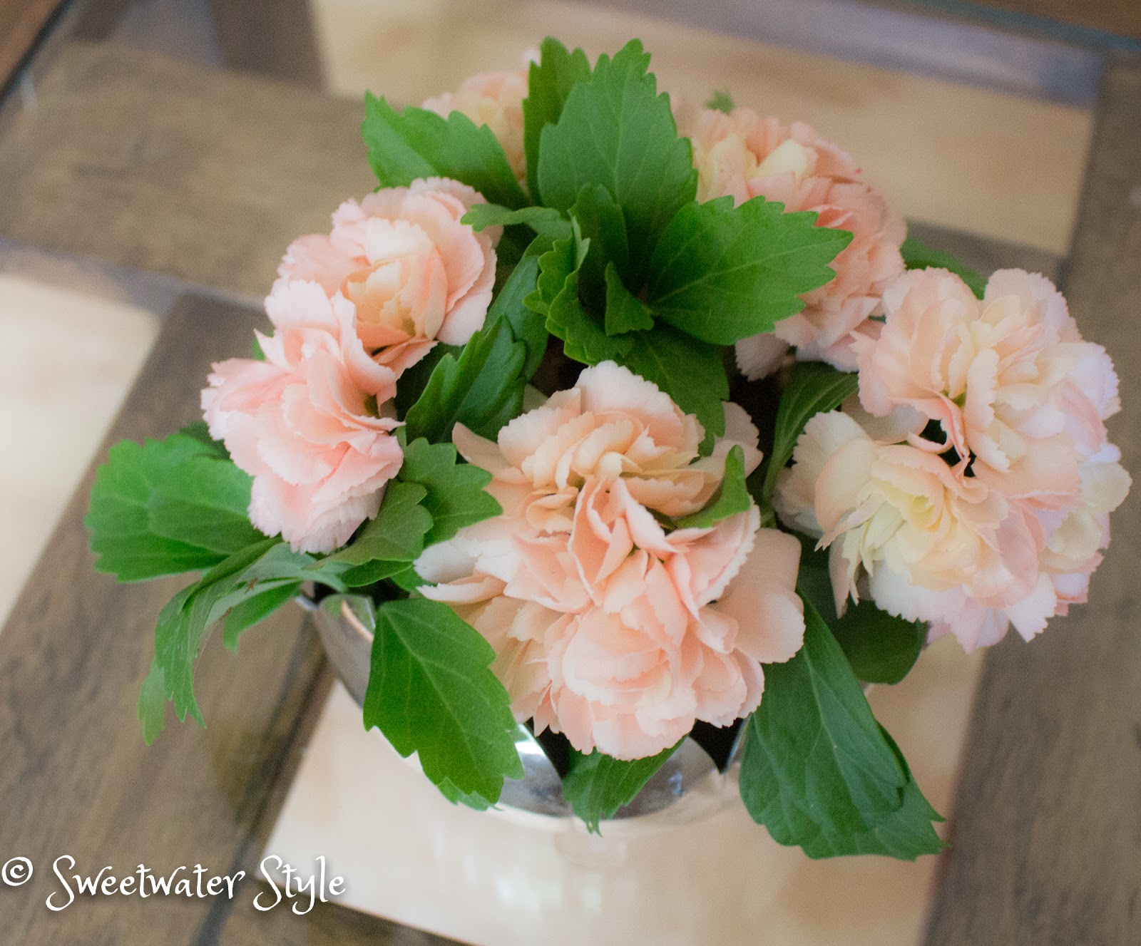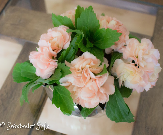 If you want an upscaled look for carnations….you have to think beyond sticking one flower in a bud vase….