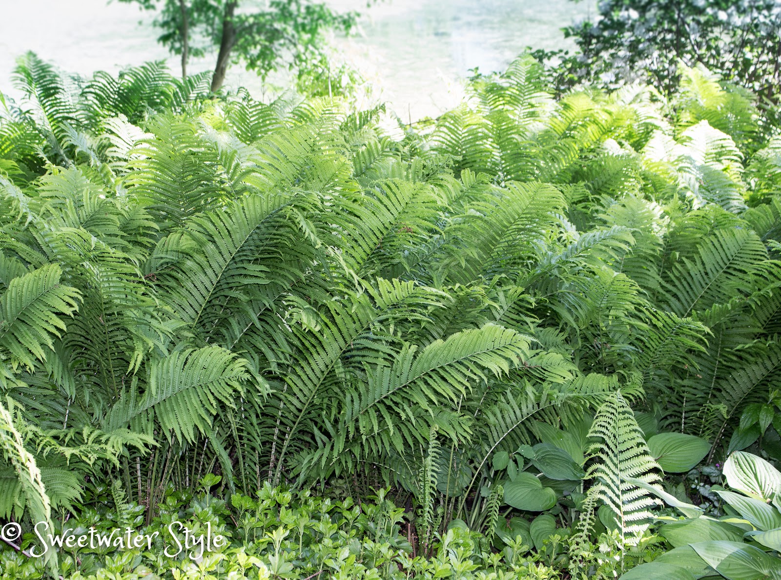 Fern- If you have shade and a lot of space, then ferns are a good ground cover. Our fern bed started with 3 little ones and now has taken over a pretty big area. Ferns are a great cover up for things like our compost bin. I am always careful walking through the ferns this time of year. Sometimes the mother deer will bed her fawns down under them….a perfect hiding place. My goodness….in this photo our ferns look more like a jungle than the woodlands!