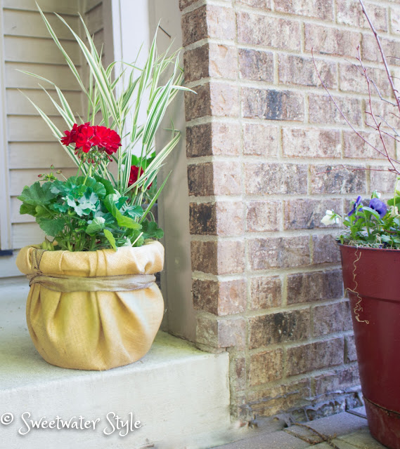 I tucked the edges of the burlap up inside the planter and secured them with some picks.