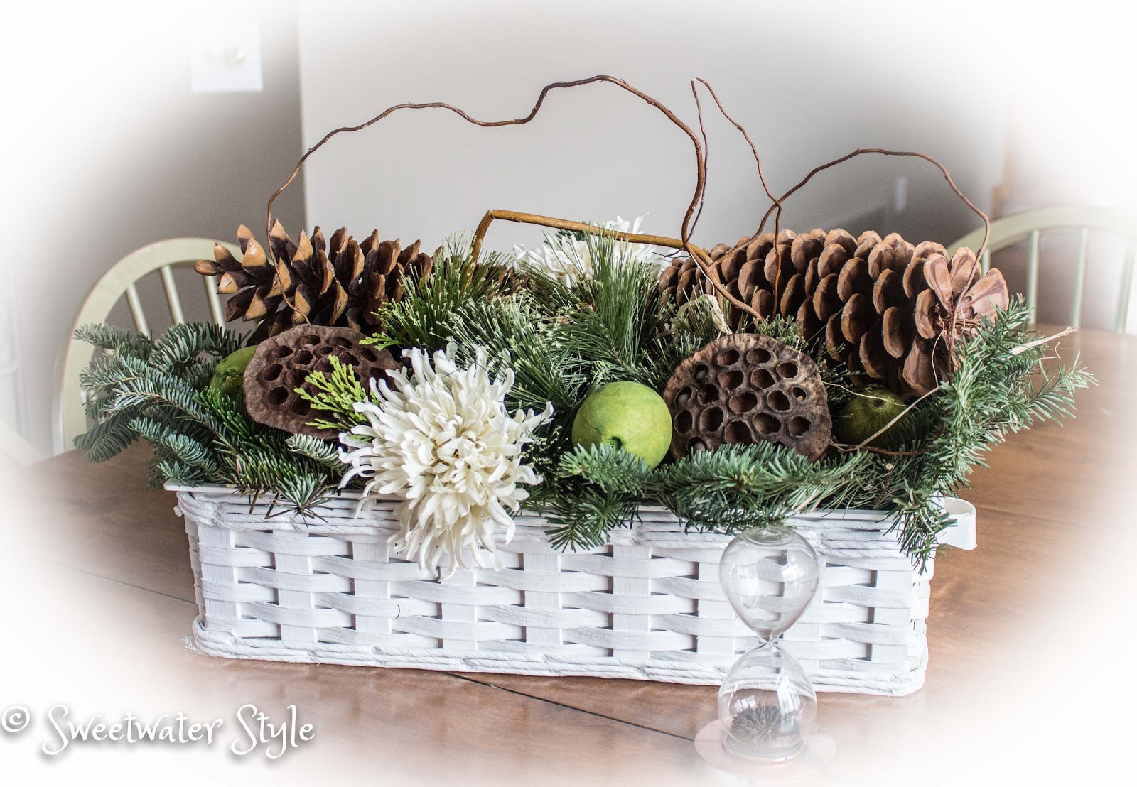 All the red is gone for this arrangement. The green pods and pine cones along with some curly willow now say Winter instead of Christmas.