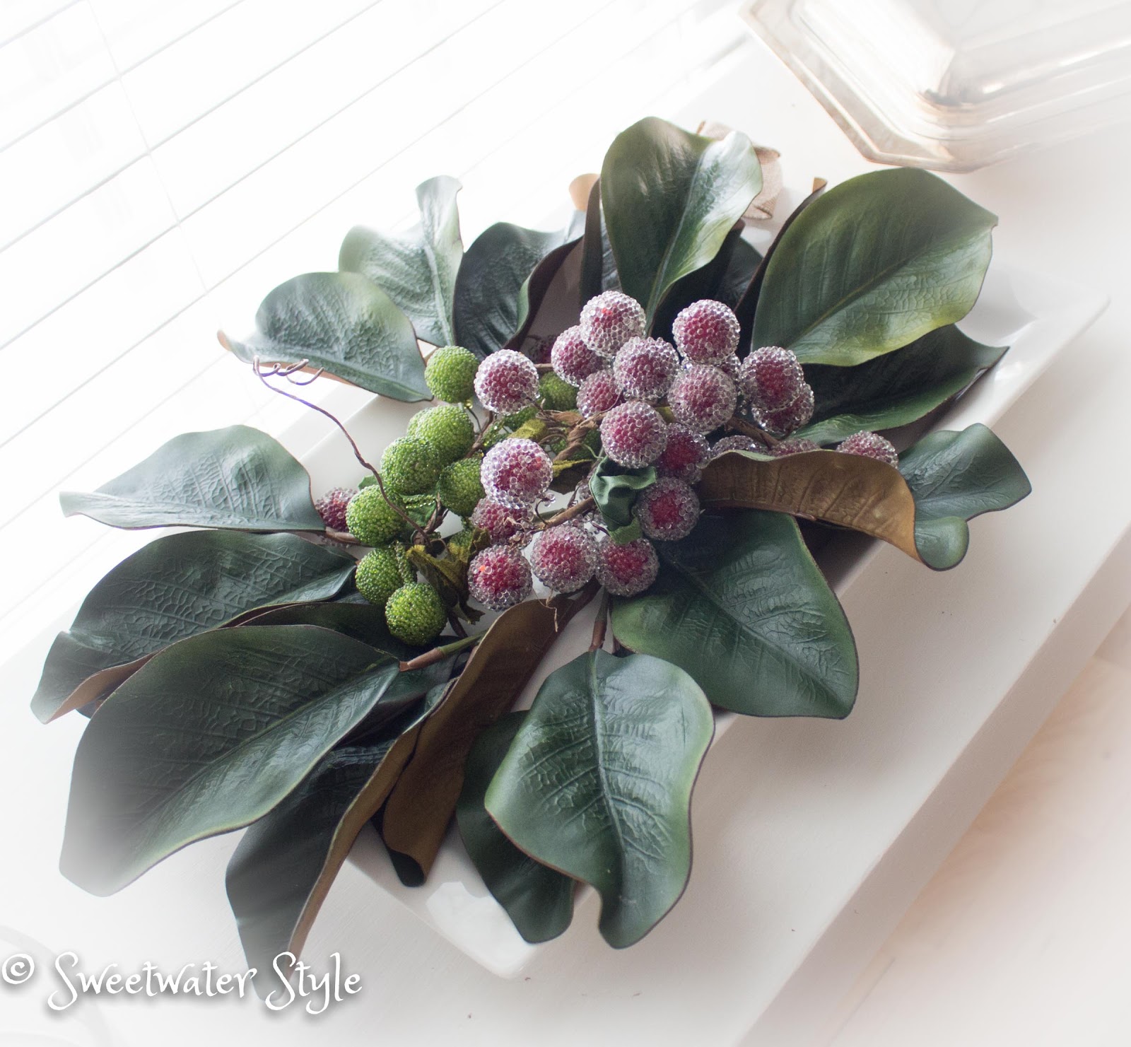 When I took the garland off the mirror in the dining room, the faux magnolia leaves and glittery grape clusters moved to a simple white tray on the sideboard.