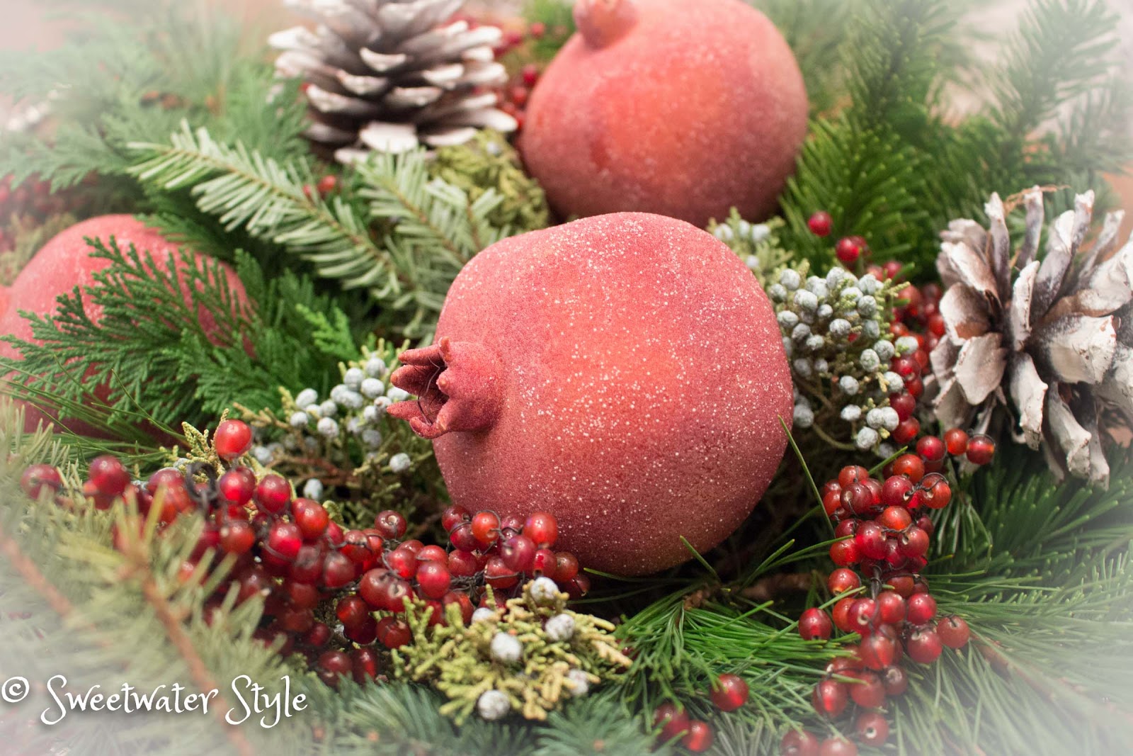 I adore these artificial pomegranates and couldn’t bear to put them away quite yet. In the smaller container with a seed pod, they look nice in the kitchen.