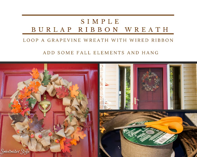 All I did was take a grapevine wreath and loop some wired burlap ribbon all around it. I did secure it in a few places with some hot glue. Then I tucked (stuck) some artificial leaves and berries .