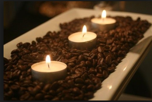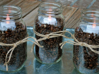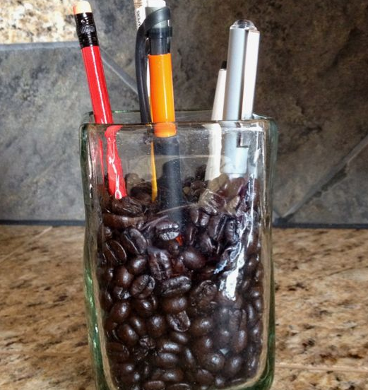 Put some coffee beans in a pretty glass, vase or funny coffee cup to make a pencil holder.